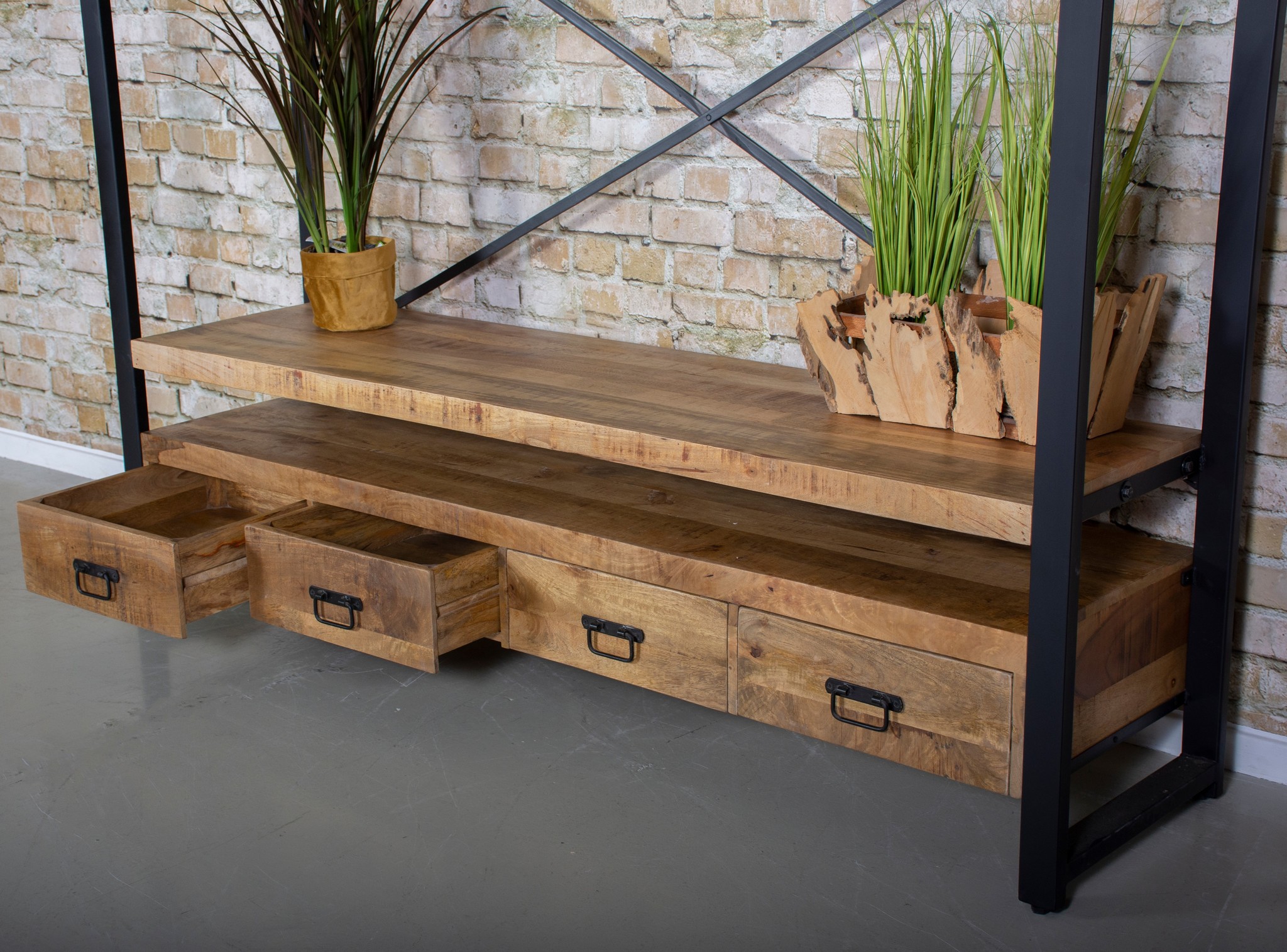 Die Wohnserie Brev ist aus Mangoholz mit schönen Farbnuancen gefertigt. Die Serie passt zu jeder Einrichtung. Das Bücherregal misst 180 x 45 x 200 cm. Dieses Bücherregal hat schöne Stahlausführungen. Die Kombination von Holz und Stahl ist immer schön. Dieses Bücherregal passt sowohl zum Landhausstil als auch zum modernen und industriellen Stil. Dieses Bücherregal kann perfekt genutzt werden, um Accessoires offen zu präsentieren. Offene Bücherregale sind derzeit ein echter Trend. In Kombination mit einem Bücherregal lässt sich dieses Möbelstück auch perfekt als TV-Möbel verwenden. In der Brev-Serie haben wir ein umfangreiches Sortiment, darunter TV-Elemente, Couchtische, Sideboards, Bücherregale, Beistelltische und Esstische in verschiedenen Größen und Anordnungen.