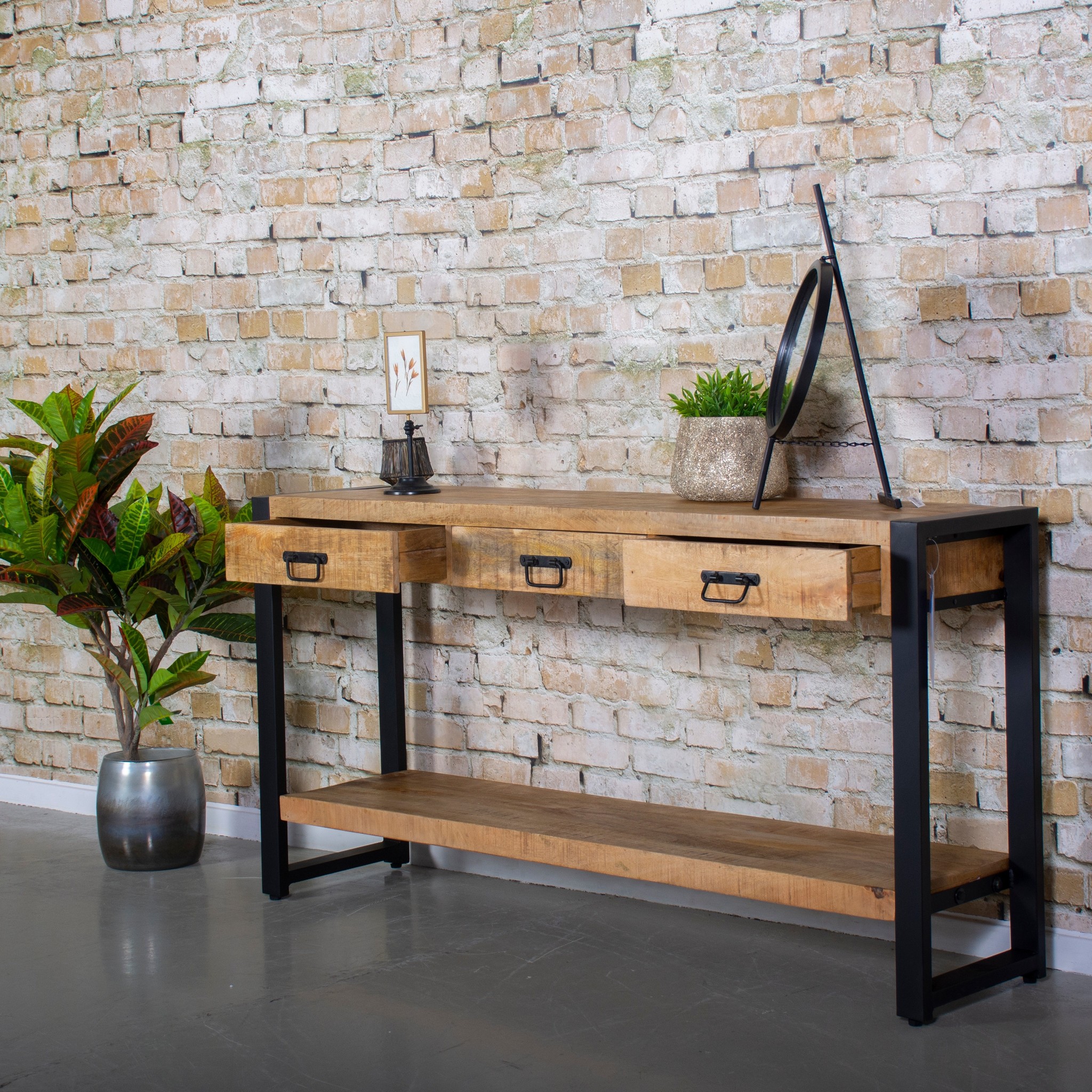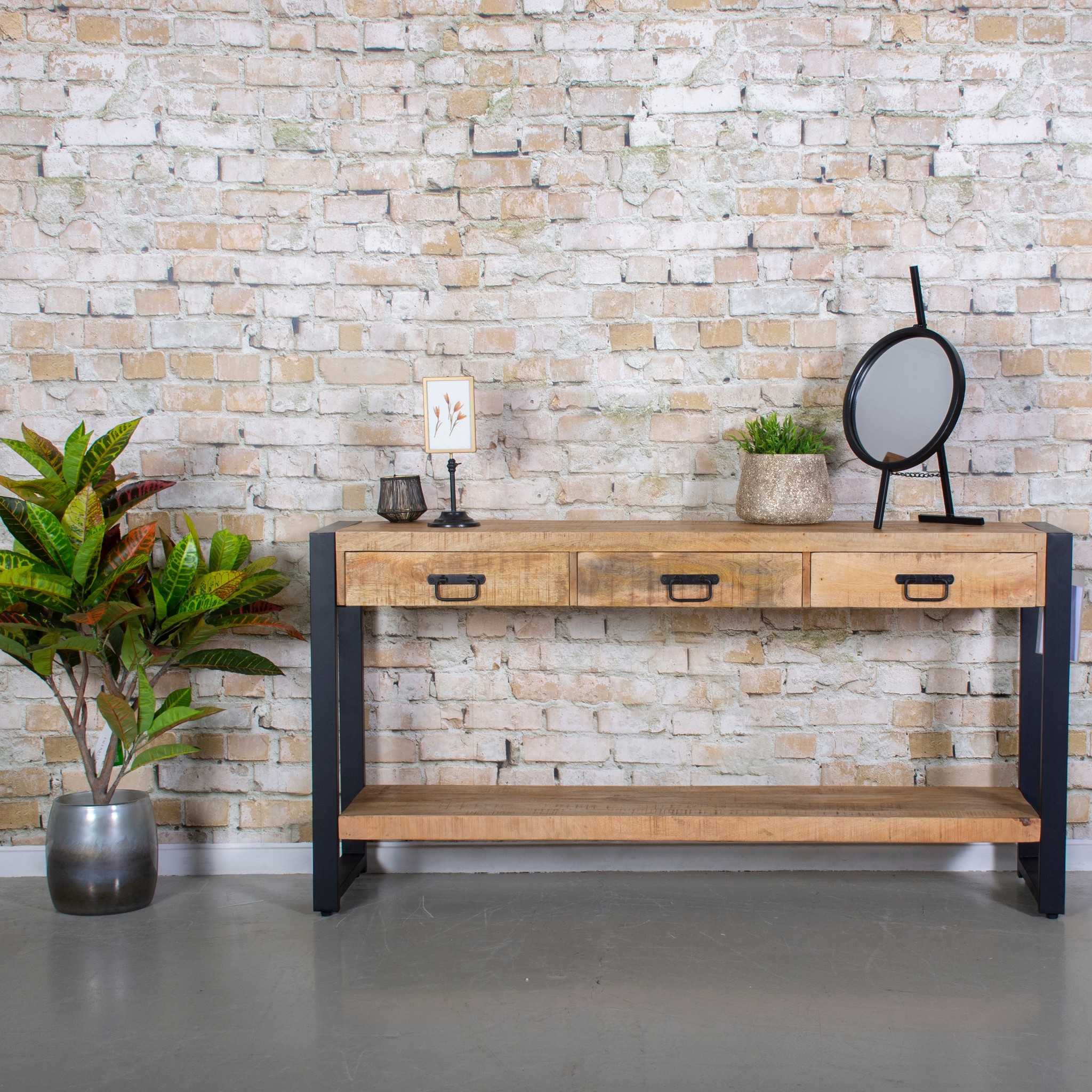 Beistelltisch Brev, aus Mangoholz mit Stahlrahmen. Die Anrichte hat drei Schubladen. Dieses Sideboard ist 150 cm lang. Die Brev-Serie aus Mangoholz ist eine echte Bereicherung für jedes Interieur. Wir haben ein umfangreiches Sortiment in der Brev-Serie, so haben wir auch TV-Möbel, Couchtische, Sideboards, Bücherregale, Anrichten, Beistelltische und Esstische in verschiedenen Größen und Anordnungen.