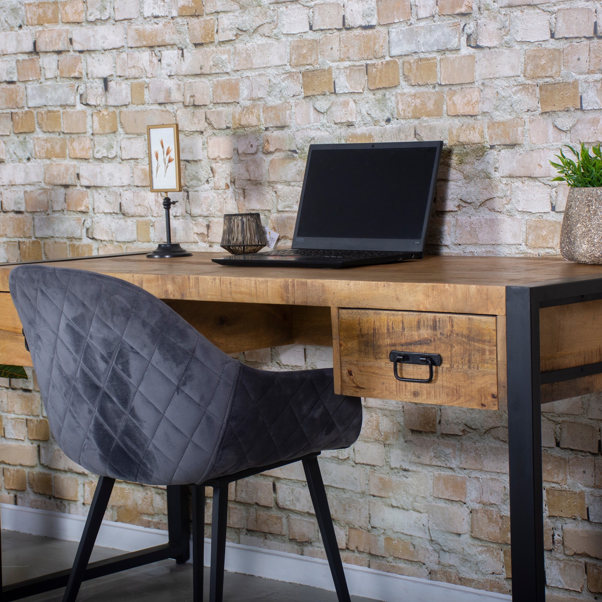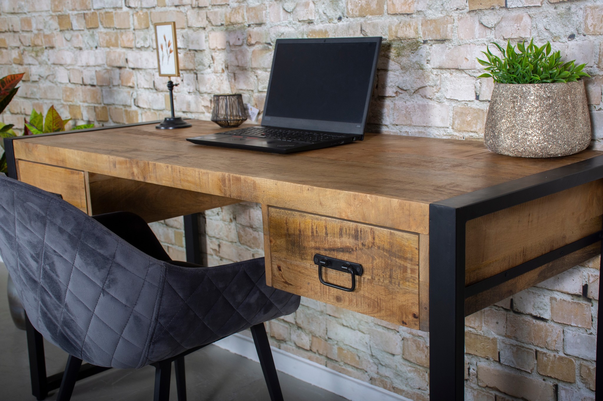 Dieser schöne Schreibtisch hat eine Platte aus Mangoholz und Stahlbeine, die sofort ein industrielles Gefühl in dein Zuhause bringen. Der Tisch hat kleine Schubladen zum Verstauen von Dingen. Der Tisch ist Teil des Brev Wohnprogramms. In der Brev-Serie haben wir ein umfangreiches Sortiment, darunter TV-Möbel, Couchtische, Sideboards, Bücherregale, Beistelltische und Esstische in verschiedenen Größen und Konfigurationen.