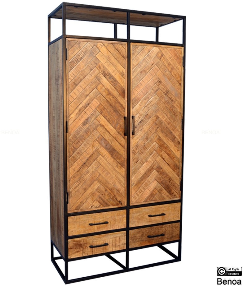 Lagerschrank Jax in natürlicher Mangoholzoptik mit schwarz pulverbeschichteten Stahlelementen. Dieser Lagerschrank Jax hat 2 Türen und 4 Schubladen und sieht in einer industriellen Einrichtung toll aus. Der Schrank ist aus robustem Mangoholz gefertigt. Charakteristisch für diesen Schrank und die anderen Möbel dieser Serie ist das Fischgrätenmuster, das in diesem Schrank eingearbeitet ist. Dieser Schrank lässt sich gut mit den anderen Möbeln aus unserer Jax-Kollektion kombinieren, z. B. mit einem Fächerschrank, einem TV-Schrank, einem Couchtisch und einem Beistelltisch. Die Maße dieses Schranks sind 200 x 45 x 100 cm.