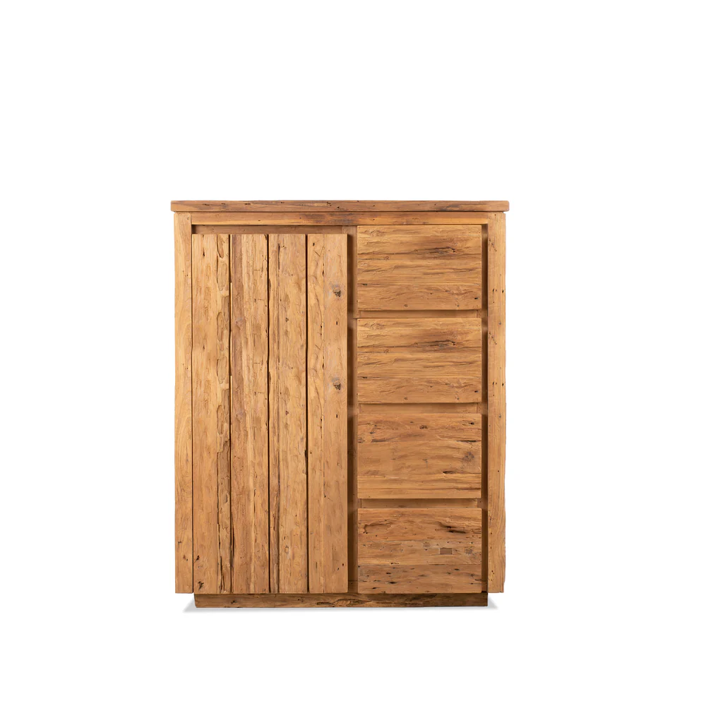 Diese robuste Kommode ist aus Teakholz gefertigt. Die rauen Holzstücke verleihen der Kommode einen rustikalen und industriellen Look. Außerdem hat sie keine Griffe, was das Holz noch schöner aussehen lässt. Außerdem hat die Kommode 1 Schrank und 4 Schubladen. Hinter jeder Schranktür befindet sich außerdem ein zusätzlicher Einlegeboden.