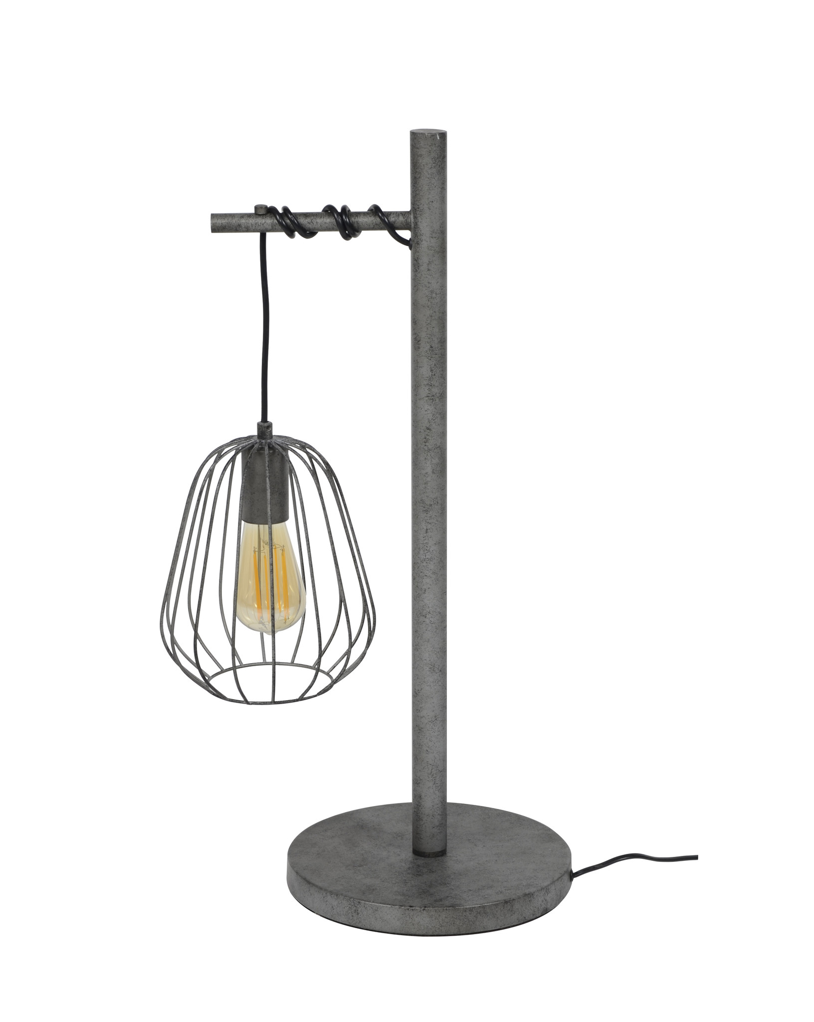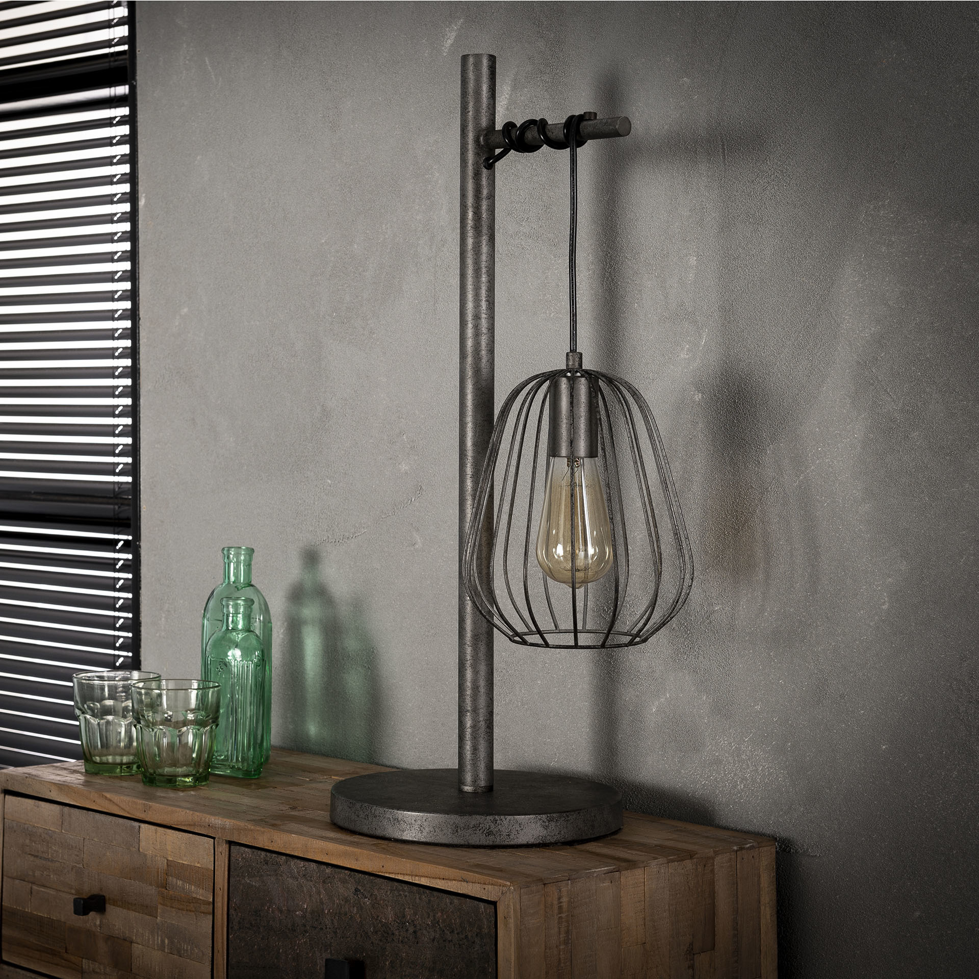 Diese Lampoon-Tischleuchte ist aus Metall gefertigt und mit einer gealterten Silberoberfläche versehen. Das Kabel kommt aus dem seitlichen Bein und ist spielerisch um die Seite gewickelt, von der der stählerne Lampenschirm baumelt. Die Lampe enthält kein Leuchtmittel.