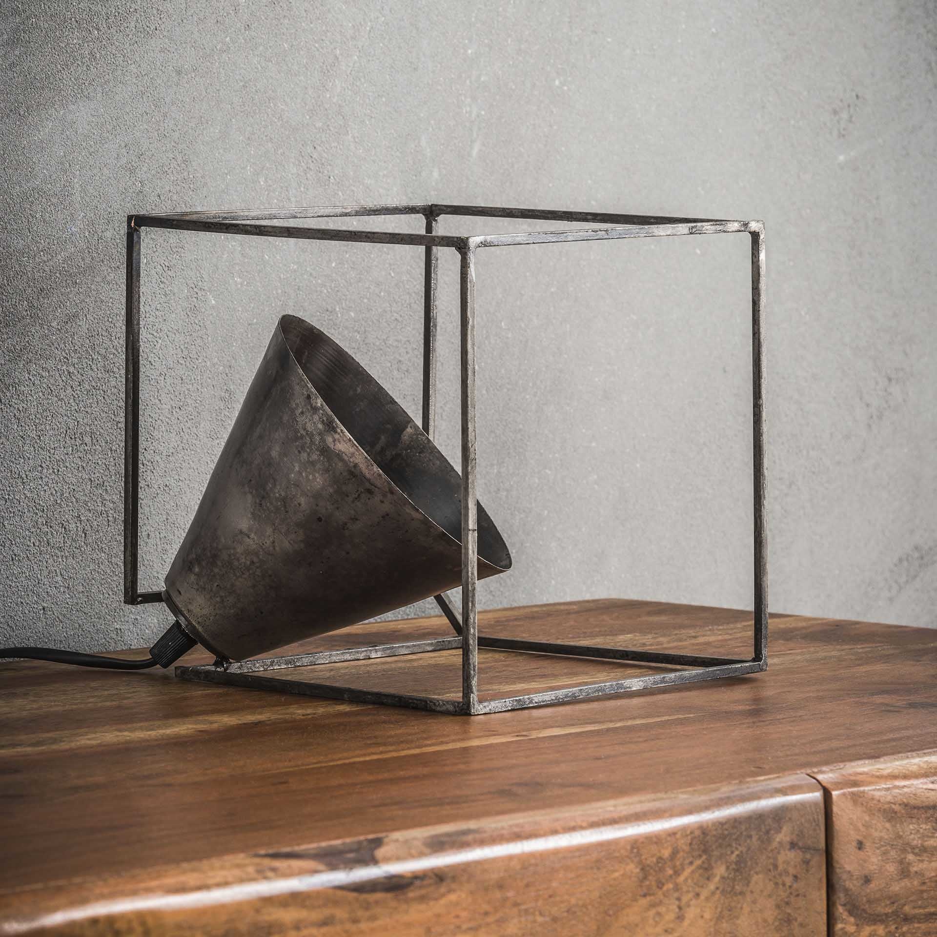 Diese Tischleuchte besteht aus einem massiven Stahlrahmen. In der Mitte des quadratischen Rahmens befindet sich der Lampenschirm mit einer Fassung. Die Tischlampe hat eine altsilberne Oberfläche. Die Lampe enthält kein Leuchtmittel.