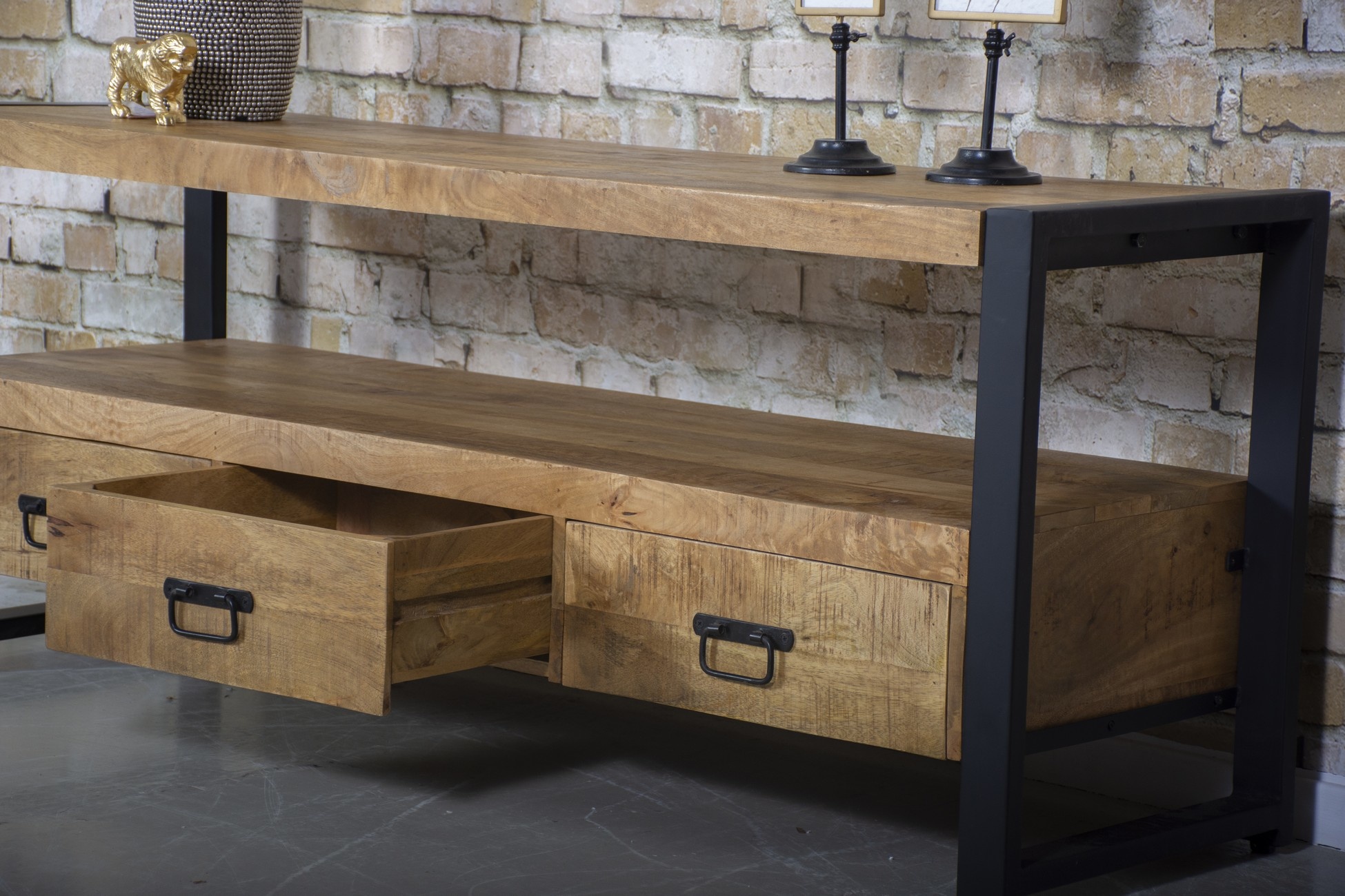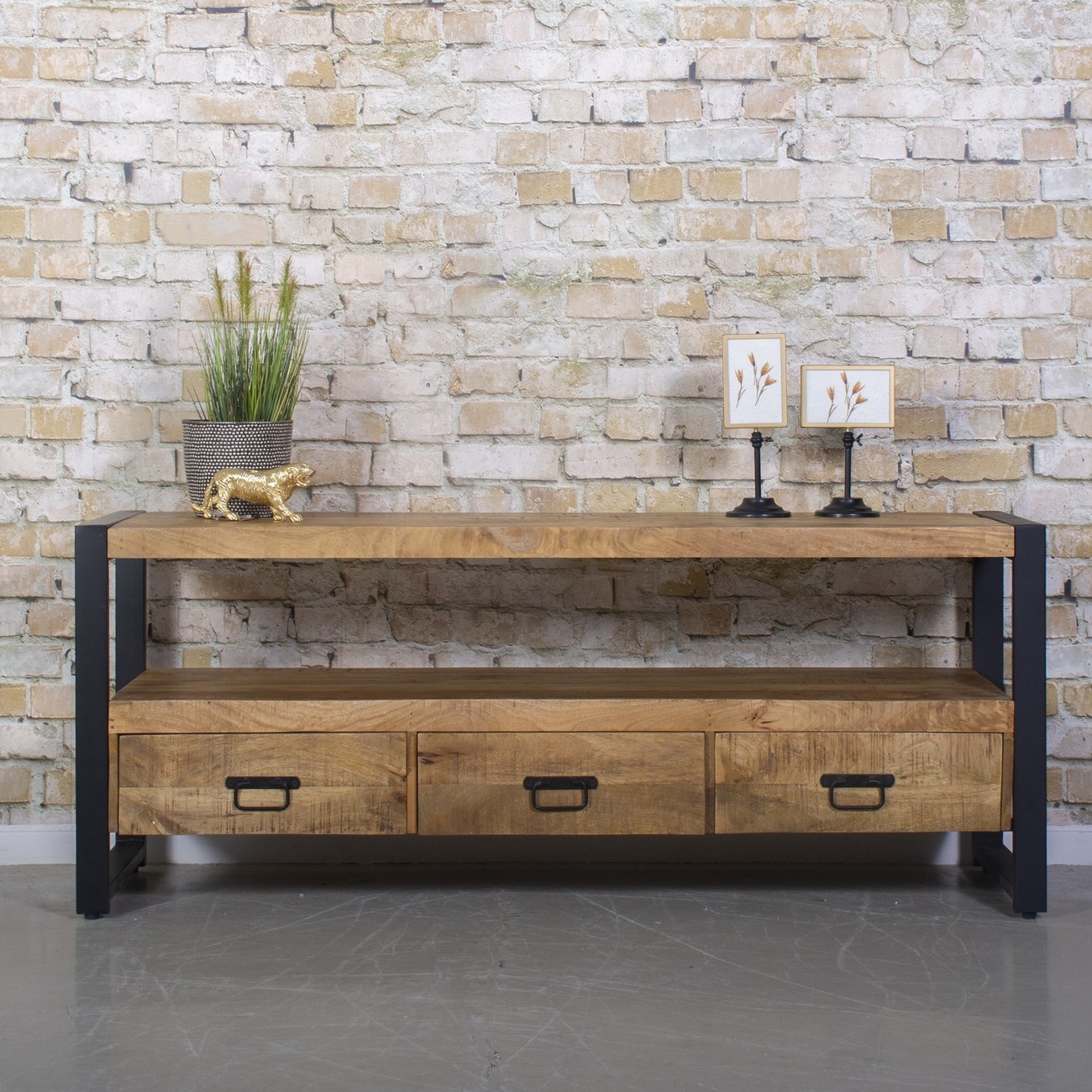 TV-Schrank Brev, aus Mangoholz mit Stahlrahmen. Der TV-Schrank hat drei Schubladen und ein offenes Fach. Das offene Fach ist ideal, um deinen Fernseher unterzubringen. Dieser TV-Schrank hat die Maße 150 x 45 x 60 cm. Die Brev-Serie ist einzigartig wegen des schwebenden Mittelblocks, der den Möbeln einen trendigen Look verleiht. Wir haben ein umfangreiches Sortiment in der Brev Serie, wir haben auch Sideboards, Couchtische, Beistelltische und Beistelltische in verschiedenen Größen und Anordnungen.
