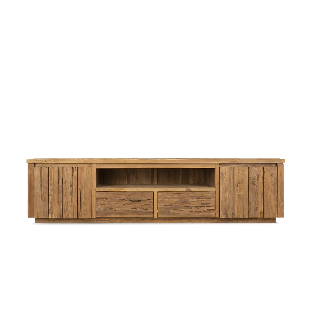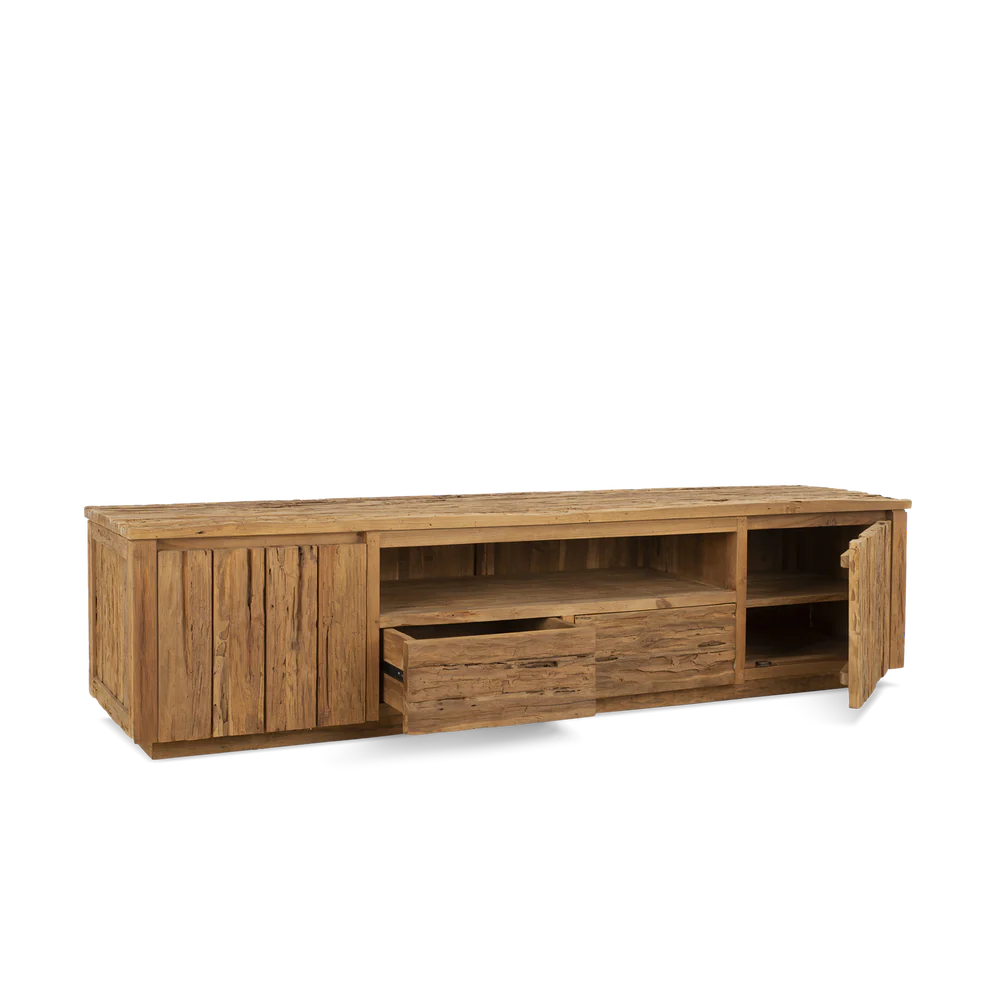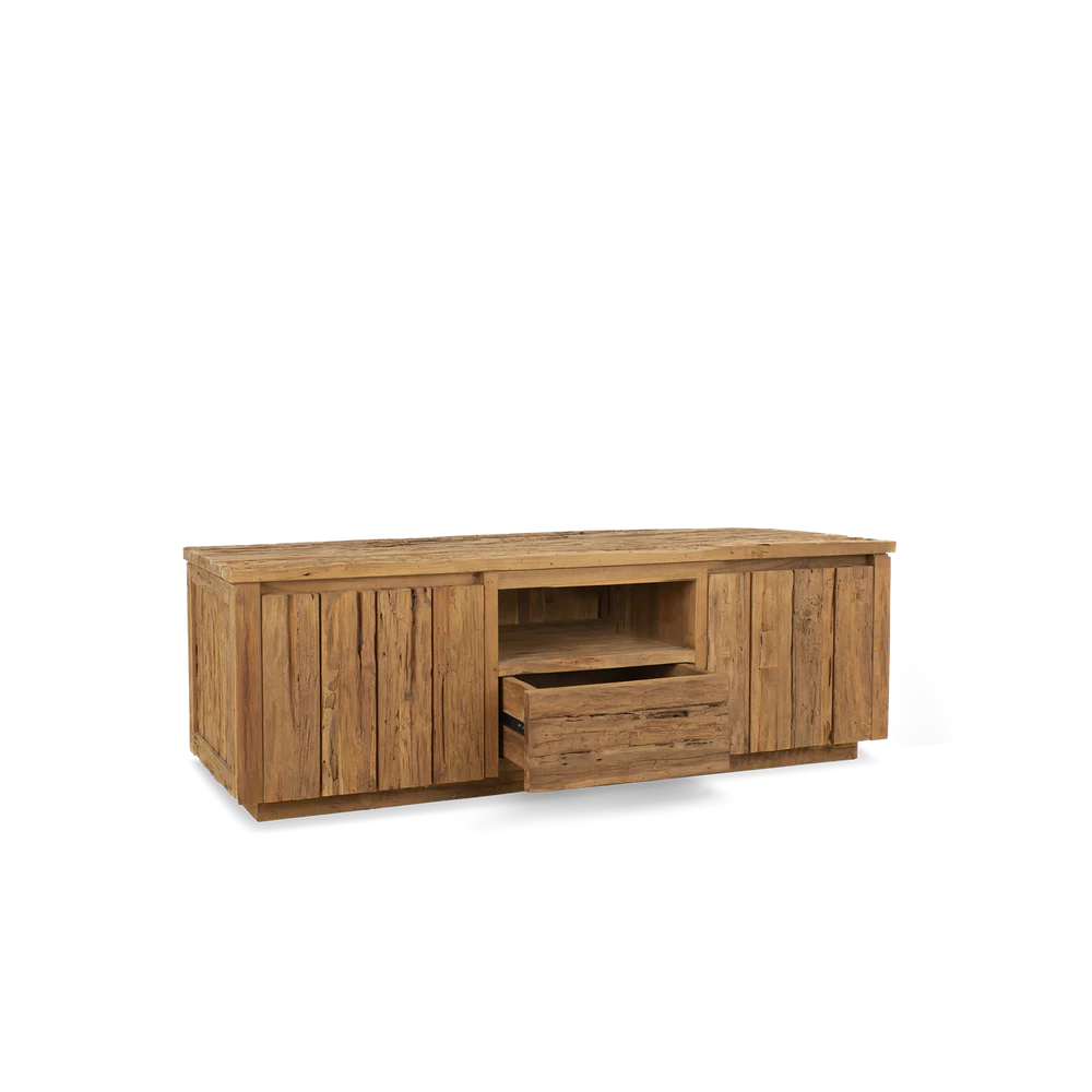 Dieser robuste TV-Schrank ist aus Teakholz gefertigt. Die rauen Holzstücke verleihen dem TV-Schrank einen rustikalen und industriellen Look. Außerdem hat er keine Griffe, was das Holz noch besser aussehen lässt. Das offene Fach ist ideal für die Unterbringung deines Fernsehers. Außerdem hat das Möbel 2 Schränke und 1 oder 2 Schublade(n). Hinter jeder Schranktür befindet sich außerdem ein zusätzlicher Einlegeboden.