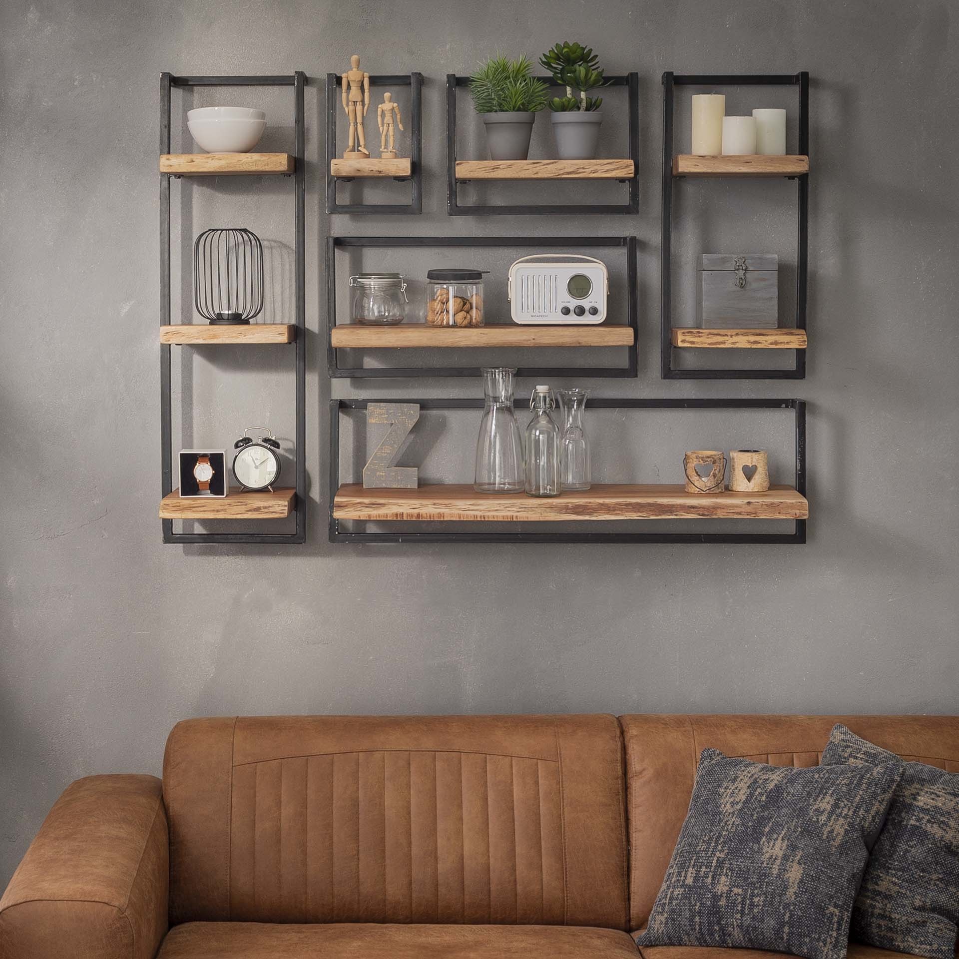 Dieses Wandregal besteht aus Akazienholzbrettern, die an einem alten Stahlrahmen befestigt sind. Die Bretter haben an den Enden eine robuste, geschliffene Baumstammform. Dieses Wandregal ist Teil des kompletten Wandregal-Sets, mit dem sich verschiedene dekorative Regale gestalten lassen. Das Wandregal lässt sich mit zwei Befestigungsösen einfach an der Wand anbringen. Dieses Set besteht aus sechs schönen Regalen. Die Gesamtmaße des Sets sind 135 x 100 cm. Der komplette Inhalt des Sets besteht aus: