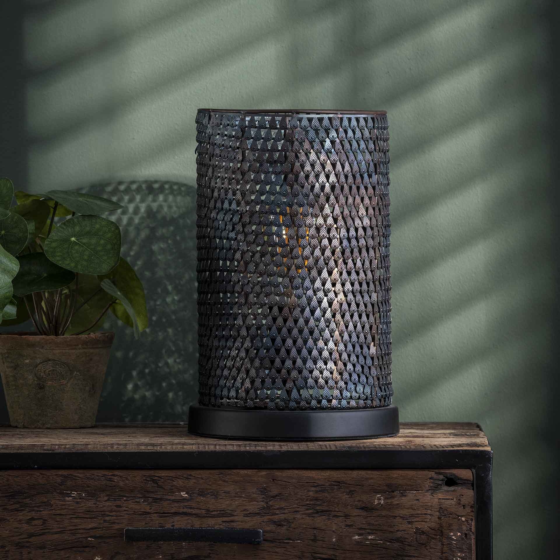 This "Alexandro" table lamp is finished in a burnt finish. This gives a black/brown colour. The lamp is completely handmade, making each lamp unique. The small holes make this lamp semi-transparent, so the light is attractively distributed through the room.