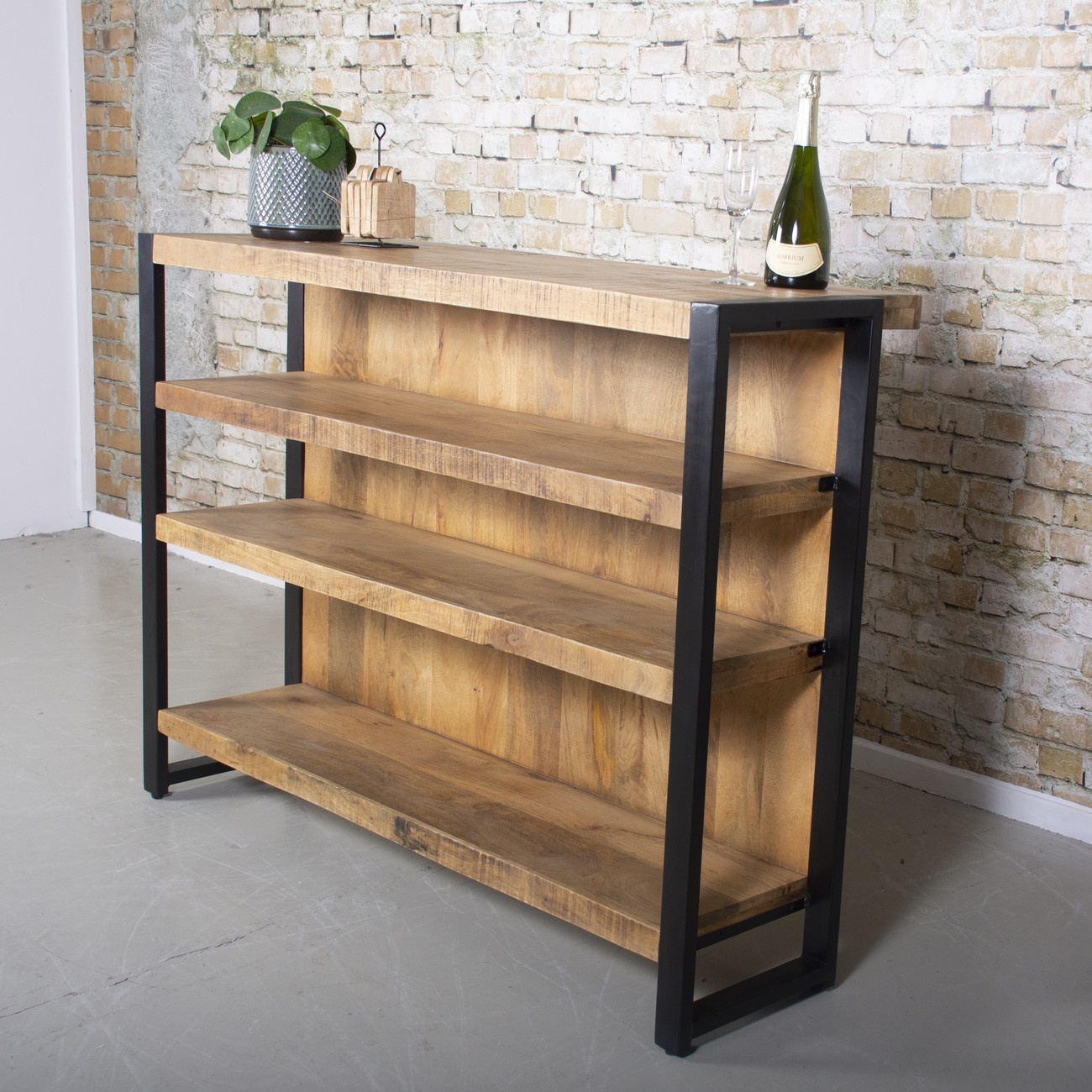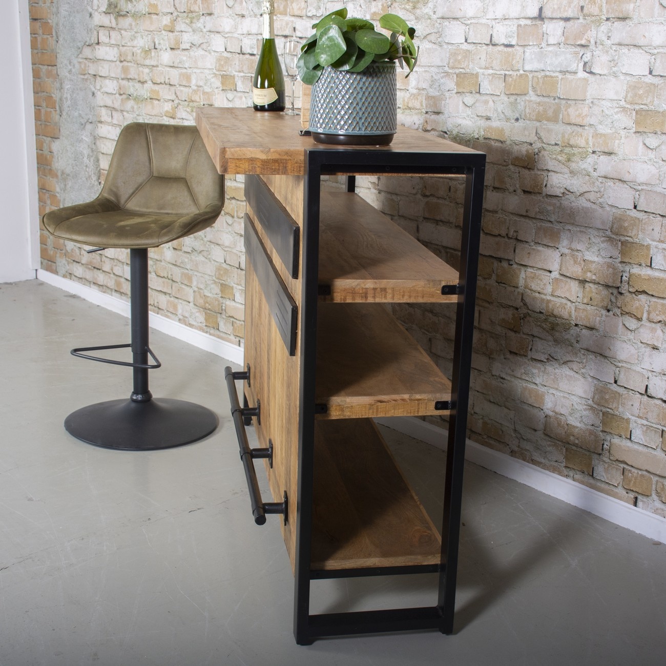 Bar table Bozz is made of mango wood with a steel frame. The bar table is the perfect addition to various interior styles. The combination of wood and steel makes this bar table a real eye catcher. The dimensions of the bar are 140 x 50 x 105 cm. The bar looks great with various interior styles such as modern, rural and industrial. The bar table is part of the Bozz living room series. This living range consists of various furniture such as TV units, sideboards, bookcases, side tables and coffee tables.