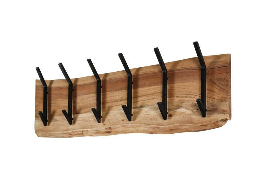 This coat rack is made of solid acacia wood 25 milimetres thick. Carefully selected wood, with a fine grain and various knots, which is processed using traditional methods. This creates a natural and unique look on the wall. In total, this model has 6 hooks with two hanging options, so that no fewer than 12 coats can be hung up. Because the coat rack is only 12 cm deep, it does not take up much space and can also be placed in a narrow hallway. The hooks are made of black sanded metal. The coat rack is fitted with two fastening eyes at the back so that it can be easily mounted on the wall.