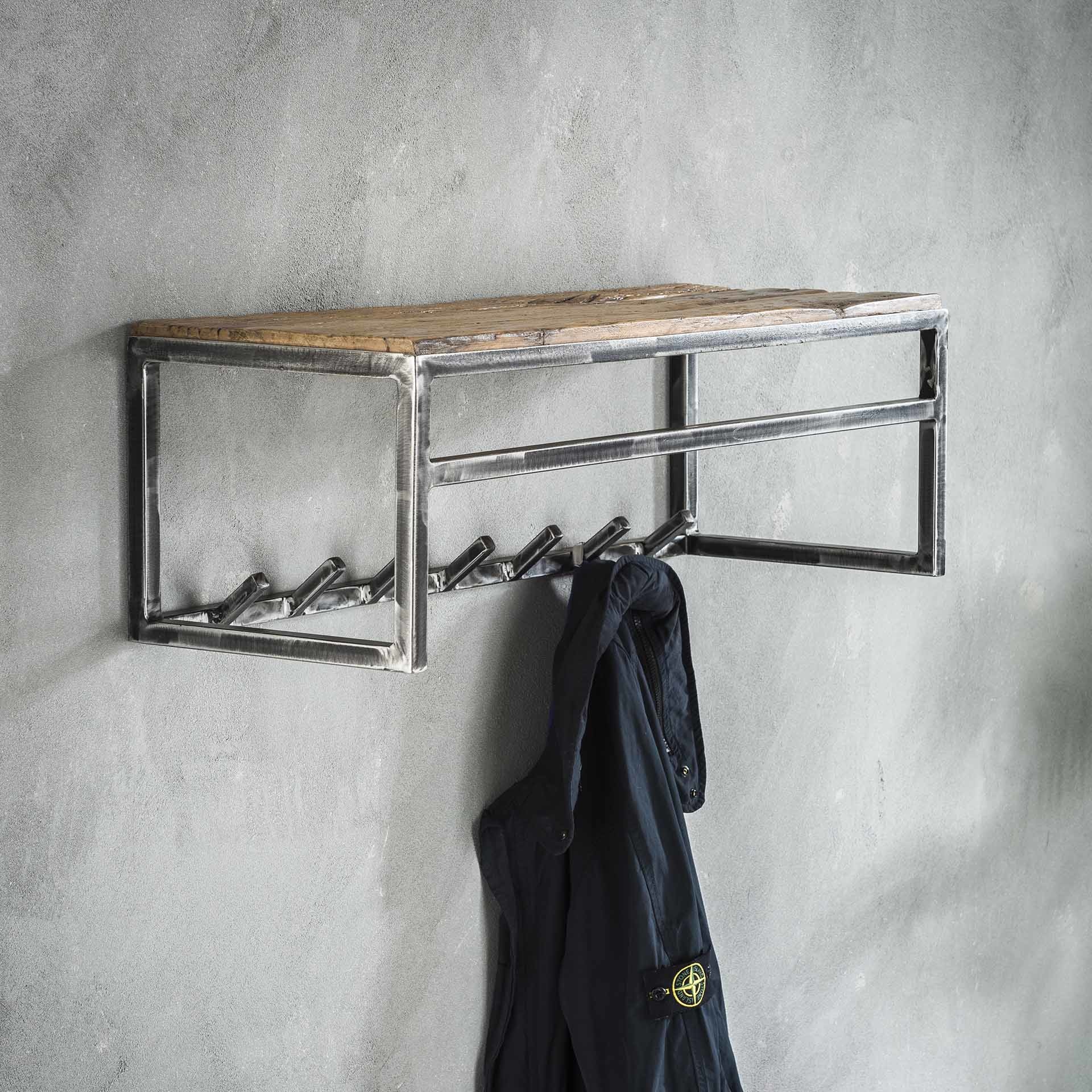 This coat rack features 7 hooks and a hat shelf, made of robust hardwood. Carefully selected wood with a robust appearance. This creates a natural and unique look on the wall. The frame is made of sanded metal and has a vintage look, making each coat rack unique and different. A sanded metal rod is attached to the hat shelf and there are 7 hooks. Coats can therefore be hung on a hook as well as a hanger. The coat rack is fitted with two fastening eyes at the back, making it easy to mount it on the wall.
