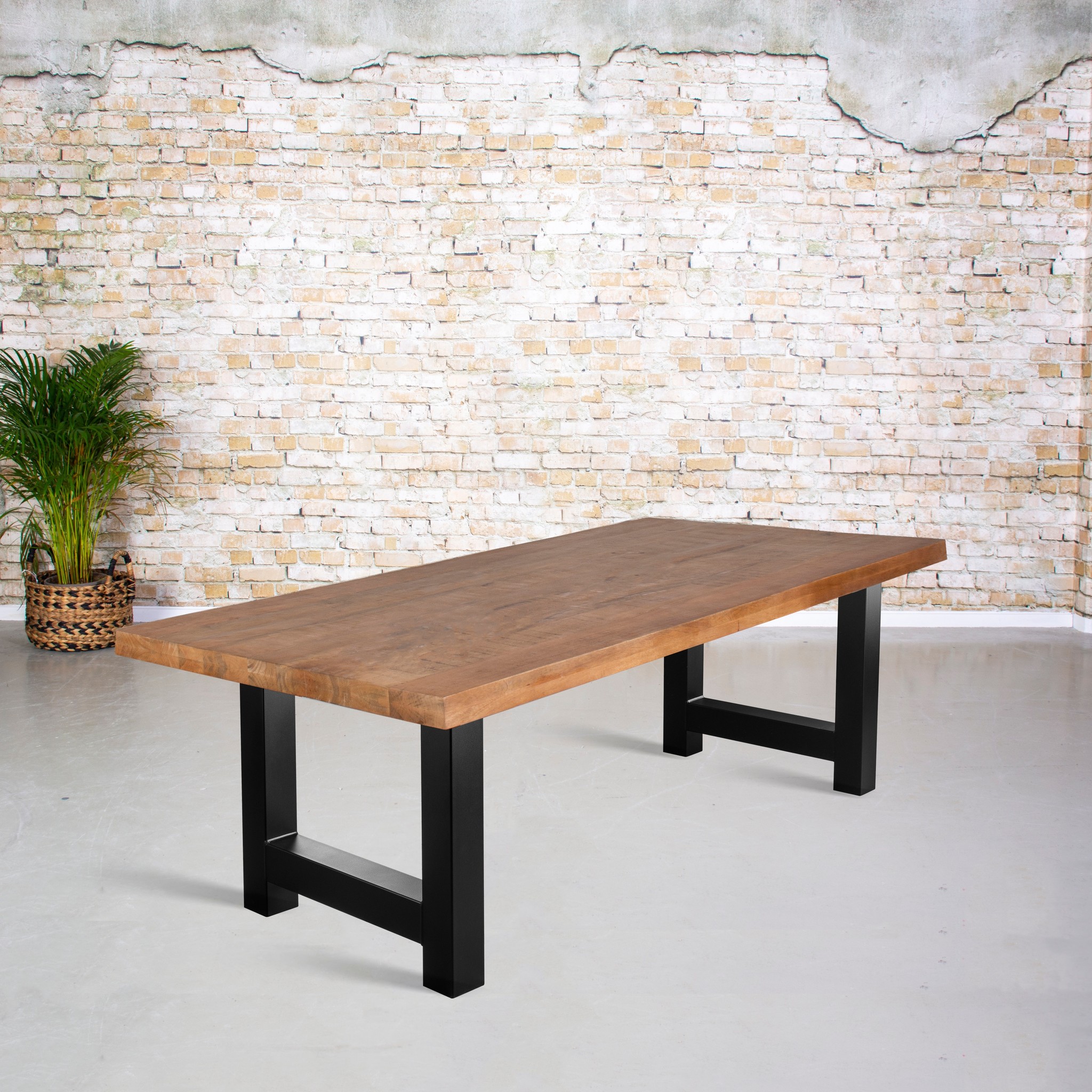 This dining table is made of mango wood. The combination of the wood with the steel, robust frame gives the table a beautiful industrial look. Thanks to the neutral colours, this table can be perfectly combined in different interior styles such as rural, industrial, vintage and a modern interior. The top has a beautiful colour and features robust darker accents. Mango wood is a natural material which makes each table unique. Our mango wood tops have a combination of an industrial and colonial look.