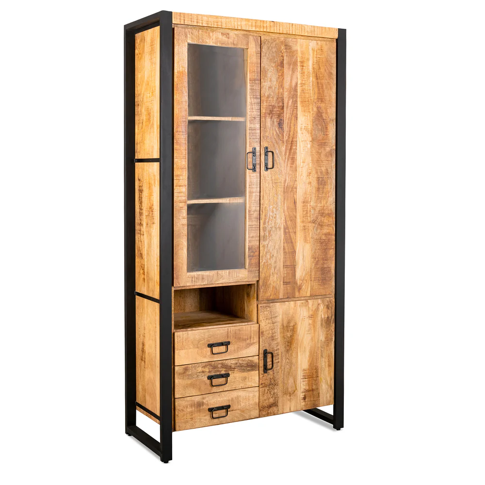 The Brev living programme is made of mango wood with beautiful colour shades. The series suits every interior. The sideboard measures 100 x 45 x 200cm. This display cabinet has beautiful steel finishes. The combination of wood and steel is always beautiful. This display cabinet is a great addition for both a country, modern and industrial style. The cabinet has 3 doors and three drawers. Behind the left door is glass where things can be nicely displayed. The lower cabinets are closed where things can be stored out of sight. In the Brev series we have an extensive range, including TV units, coffee tables, sideboards, bookcases, side tables and dining tables in various sizes and configurations.