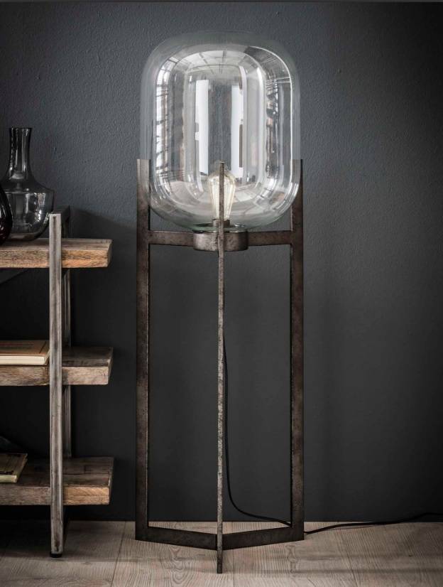 This floor lamp features a glass shade set in a steel frame with a silver finish. The power cable is neatly hidden in the centre of the three-legged frame. A table lamp is also available of this sturdy lamp. Lamp does not include light sources. We recommend a nice LED lamp for an atmospheric look.