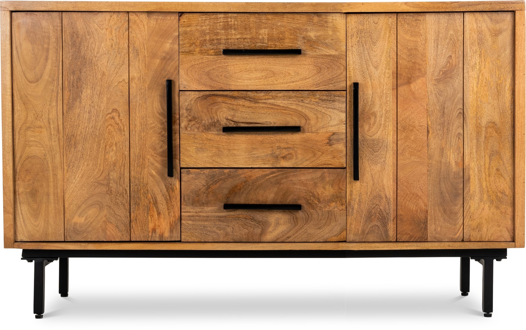Sideboard Jayden is made of mango wood. This model features three drawers and two doors.