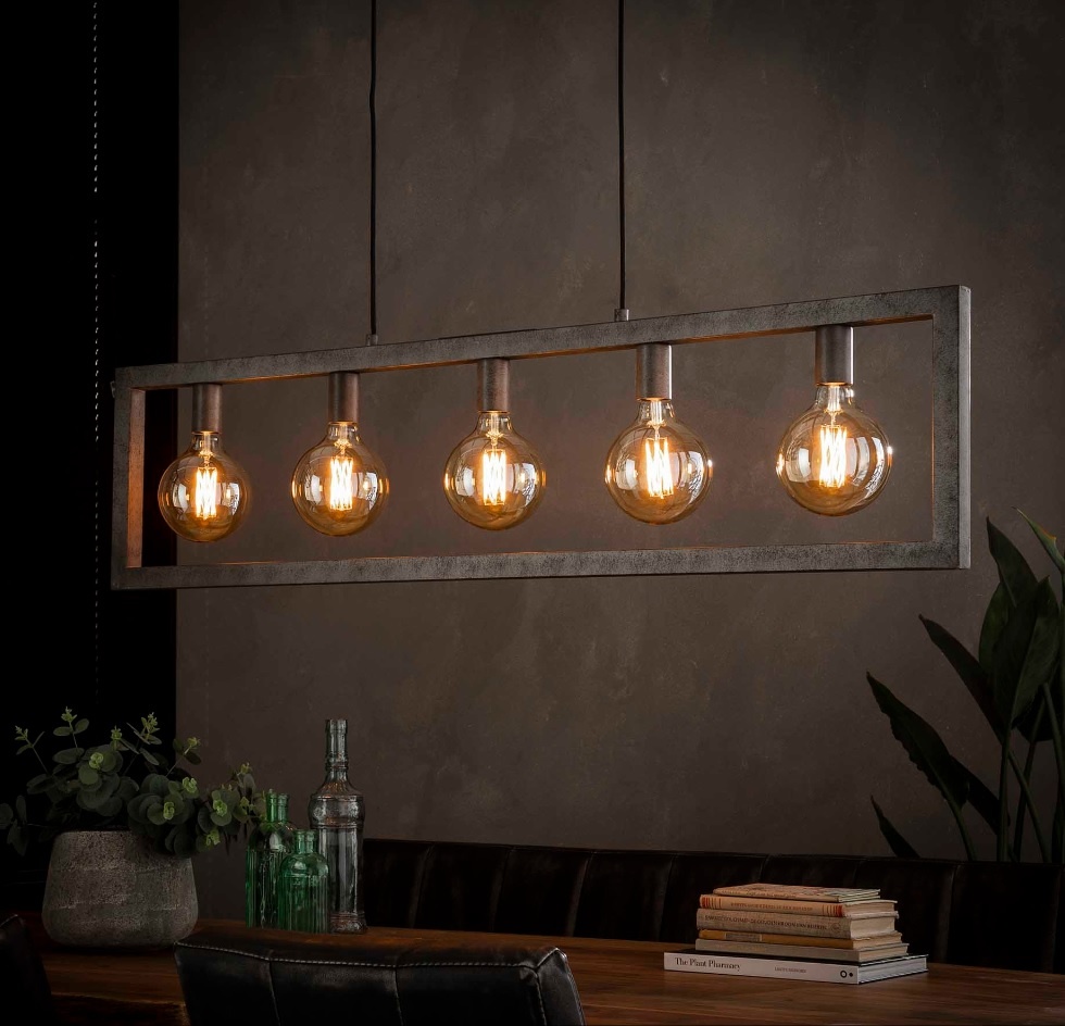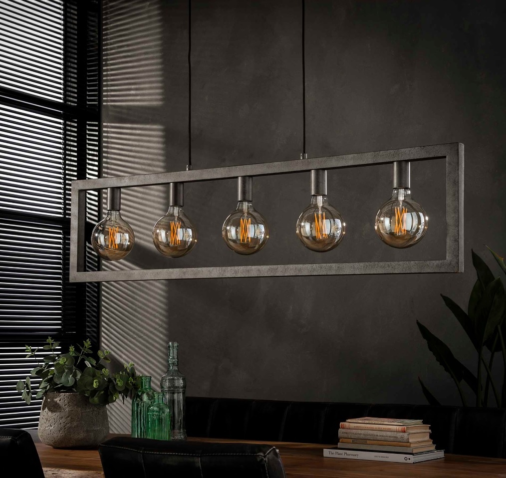 The 7 light sources hang nicely in line in the frame, providing sufficient light above the table and in the room. Atmospheric and efficient. Lamp does not include light sources. For an atmospheric look, we recommend using a rustic LED bulb. The maximum light output for this lamp is 40 watts.