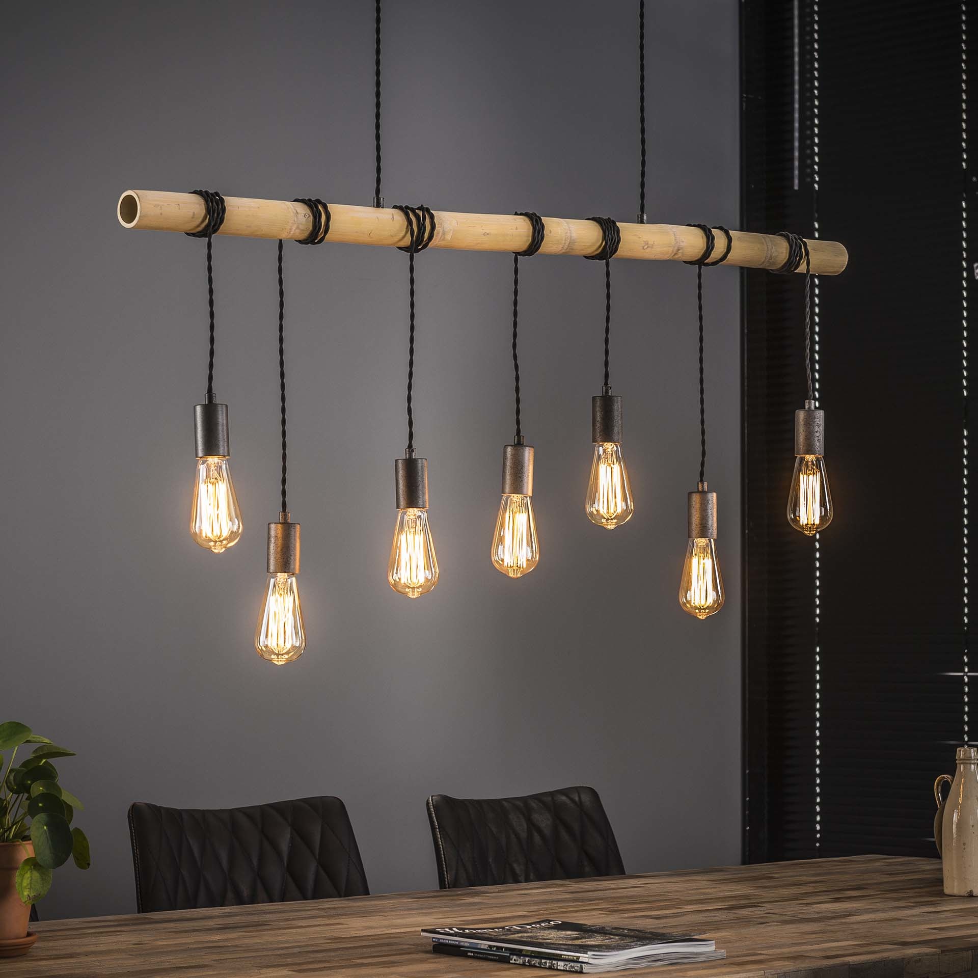 This pendant lamp features 7 fittings into which, according to your own choice, various light sources can be twisted. Moreover, the cables can be wrapped around the wooden bamboo pole as you wish, so the light sources will hang at different heights. This way, the lamp perfectly matches your home and wishes! The pole is connected by two cables to the ceiling fixture, which is made of metal with an old silver finish. Lamp does not include a light source.