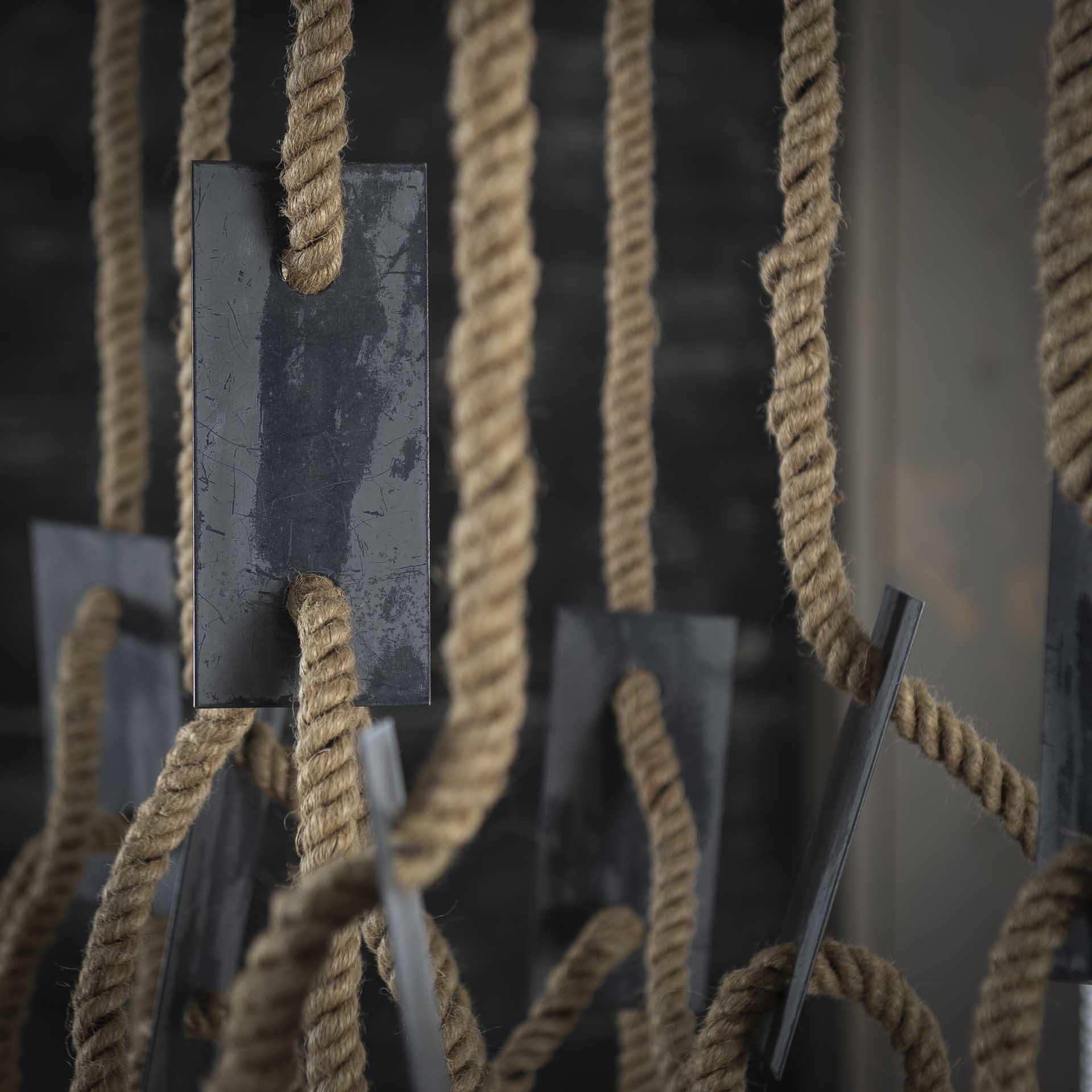 This pendant lamp has seven fittings, the fittings hanging from jute ropes in which the power cables are woven. All ropes are individually adjustable in height up to 150cm, creating a playful effect and allowing you to adapt the lamp perfectly to your needs and interior!