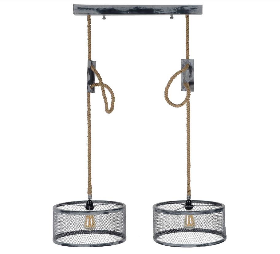This 2-light pendant lamp features shades of two swept grey. This gives the lamp a cool concrete look. This concrete look can also be found on the ceiling fixture. The two shades further hang from a coarse rope with a diameter of about 2 centimetres. This is easily adjustable in height. Lamp does not include light sources.