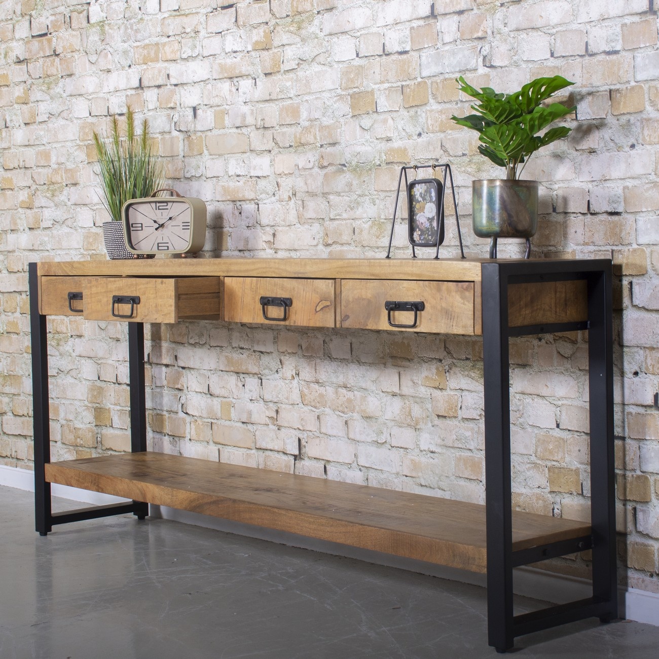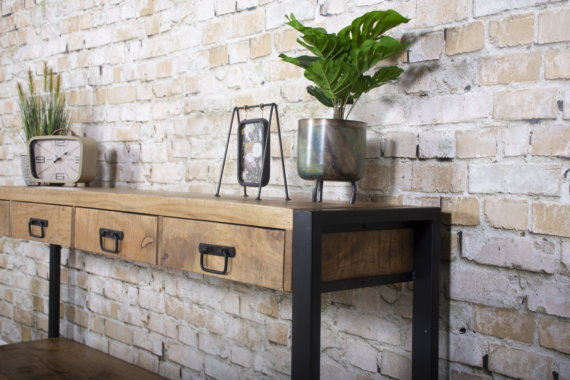 Sidetable Brev, gemaakt van mangohout met stalen frame. Het dressoir heeft 4 lades. Dit dressoir is 180 cm lang. De Brev mangohouten serie is een echte aanvulling voor ieder interieur. In de Brev serie hebben wij een uitgebreid aanbod, zo hebben we ook tv-meubels, salontafelsdressoirsboekenkastenbuffetkastenside-tables en eettafels in verschillende afmetingen en opstellingen.